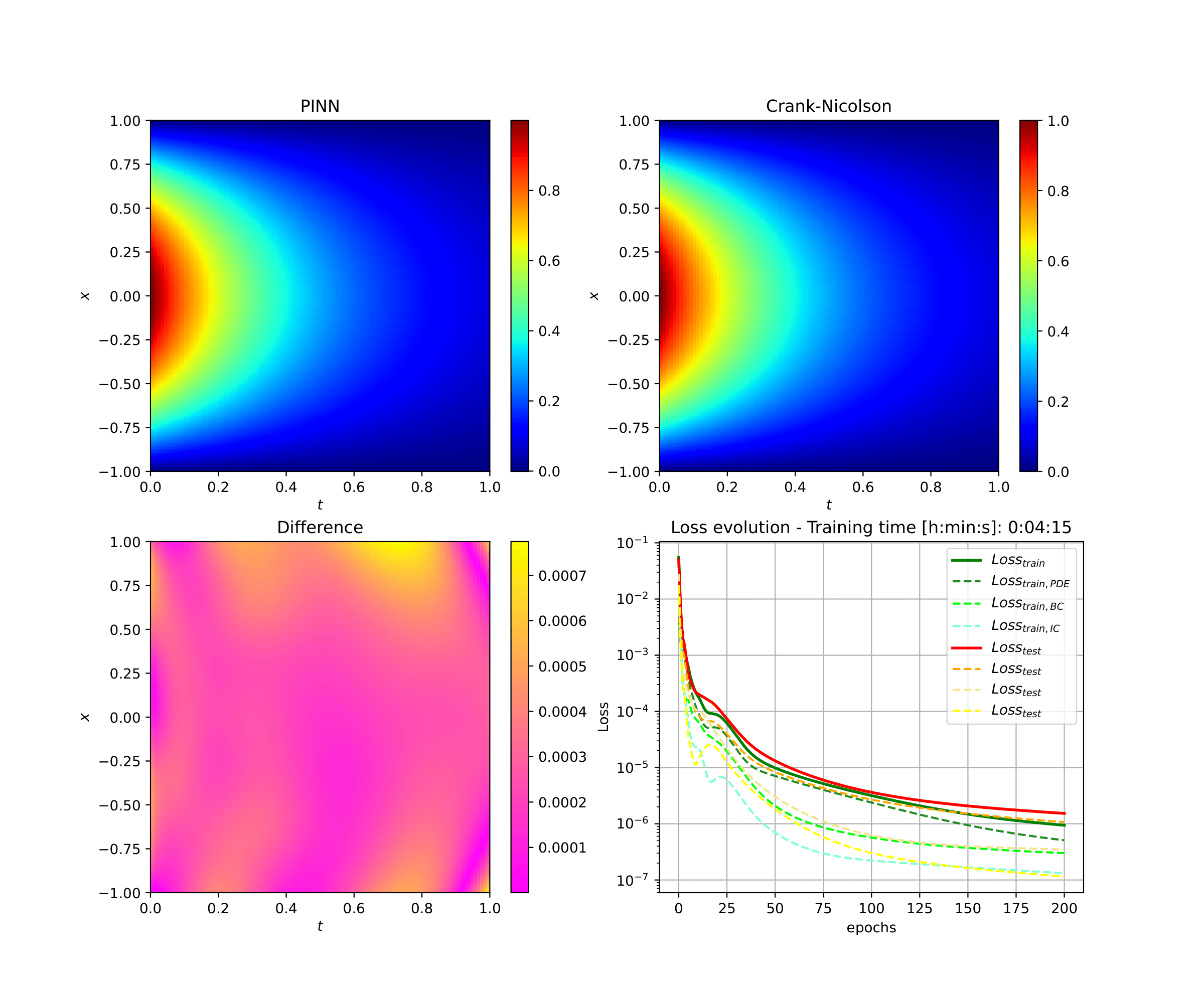 Sur cette figure, une résolution par PINN a été effectuée, comparée à une solution analytique. On peut remarquer que la différence entre les solutions exacte et approchée est très faible, voire quasi-nulle sur le disque unité.