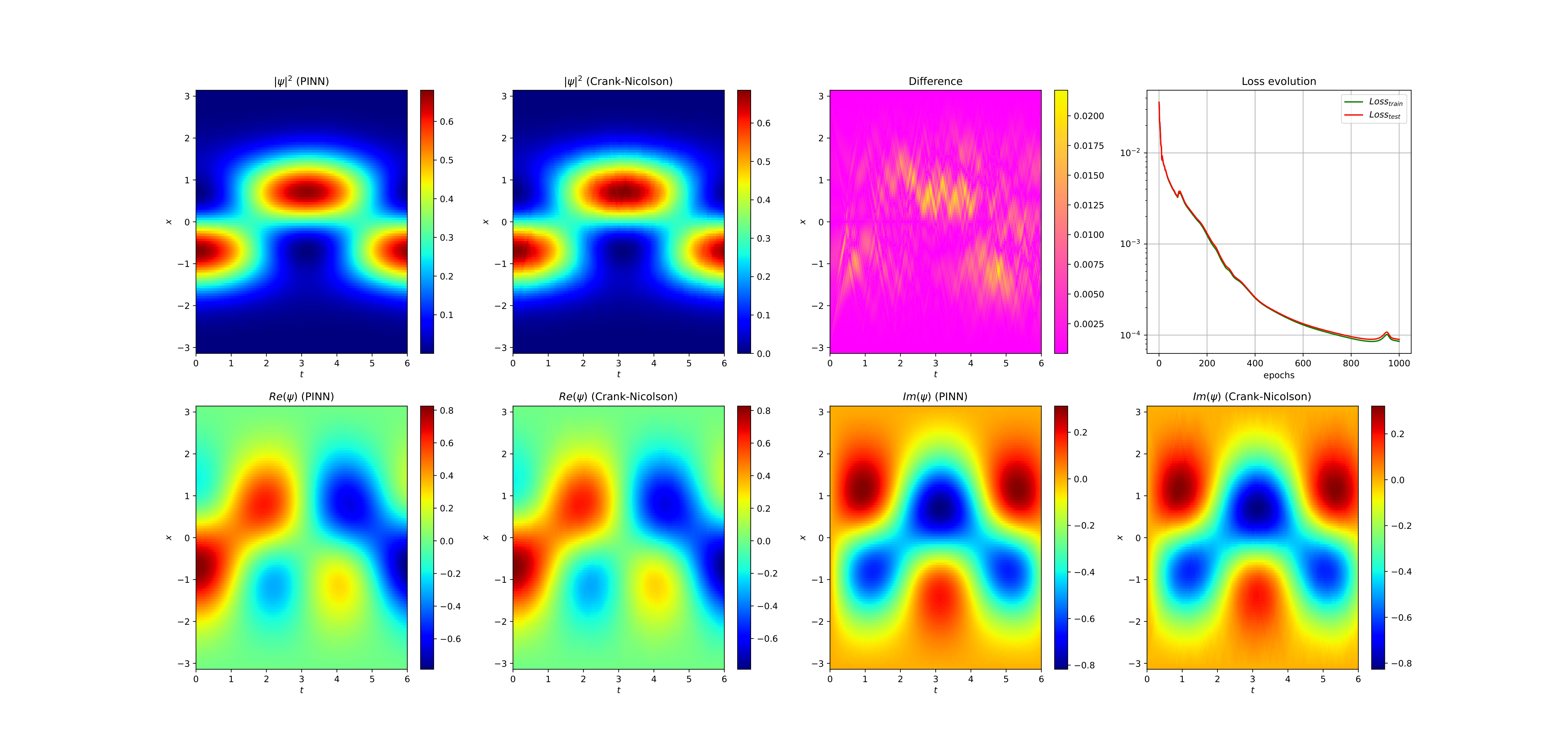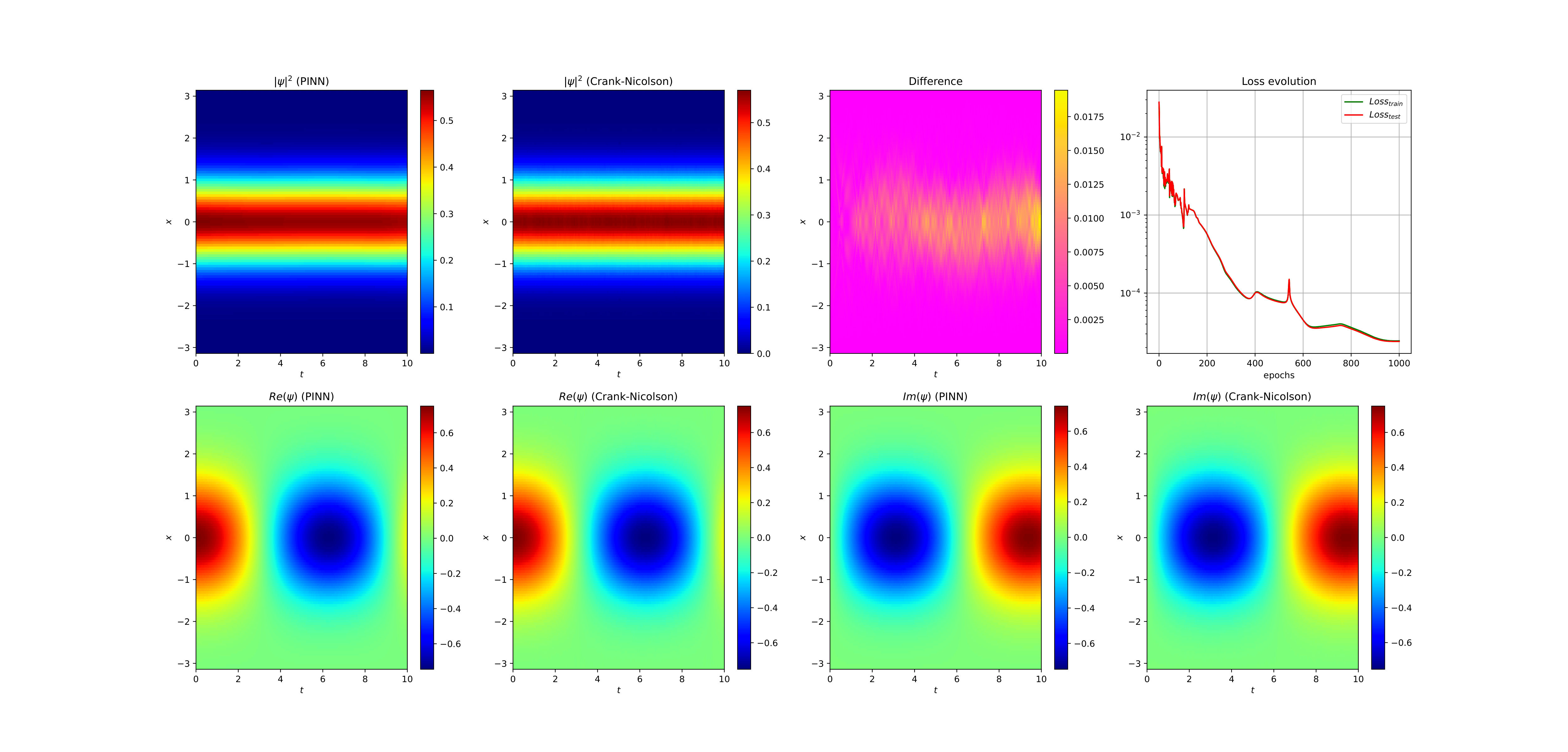Sur les deux figures ci-dessous, on fait une résolution via un PINN avec deux conditions initiales différentes. La première figure correspond à une résolution avec un temps long et la première fonction propre de l'Hamiltonien comme condition initiale (ce qui explique le fait que le carré du module de la fonction d'onde trouvée reste constant). La seconde figure correspond à une résolution similaire avec comme condition initiale une combinaison linéaire des première et second fonctions propres de l'Hamiltonien (normalisées, de telle sorte à avoir une densité de probabilité). Dans les deux cas, une approximation de la solution exacte est calculée via un schéma itératif de Crank-Nicolson (Point Milieu) et sert de référence (bien qu'il existe cependant une solution analytique avec les conditions initiales fournies). On peut remarquer une faible erreur entre la solution approchée par PINN et la solution de référence.