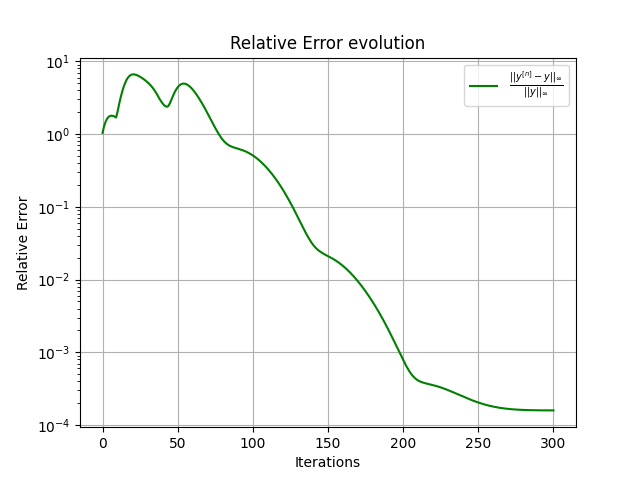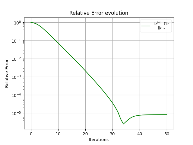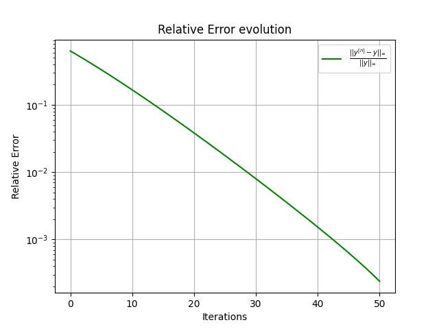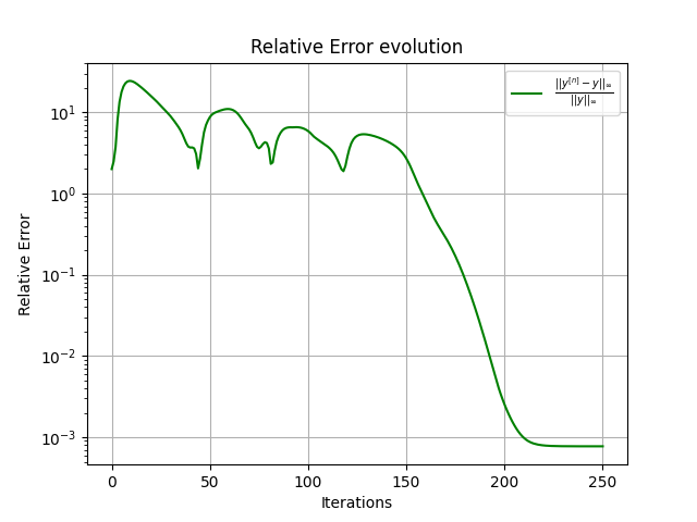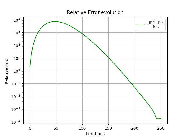 On compare ainsi les itérations avec une solution de référence, calculée via une méthode d'Euler explicice avec un petit pas de temps. Sur les tests numériques, l'image à gauche représente l'évolution de la différence entre cette solution de référence et \(y^{[n]} \) pour tout \( n\).